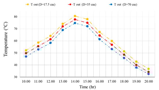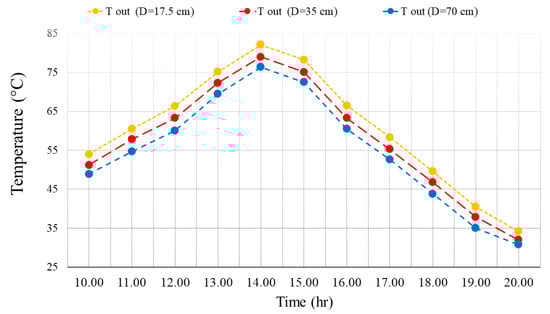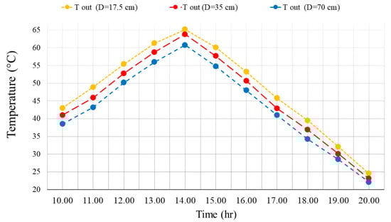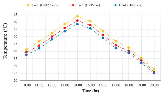 The effect of the size of the outlet and inlet valve on the outlet TEM of the wall is presented in Figure 11 for different times of the day in the presence of PCM. Adding PCM to the wall reduces the amount of output TEM in the morning but increases the amount of output TEM in the afternoon. It can be seen that the shrinkage of the air outlet hole also enhances the amount of TEM in the outlet of the wall. At 2 P.M., the increment in the TEM from a 70 cm hole to a 35 cm hole is 4.5% and from a 35 cm hole to a 17.5 cm hole is 3.7%.