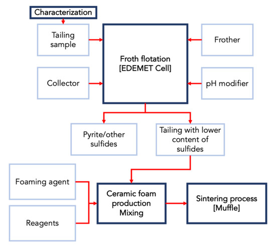 Several studies have shown the use of different type tailings as raw materials on the elaboration of ceramic foams, due to the high content of Si- and Al-based compounds, which are essential to promote the formation of the glass phase during the sintering process. In addition, the presence of the alkaline and alkaline earth oxides promote the liquid phase formation during the sintering process. The use of different type of tailings takes into consideration the modification of different manufacturing variables such as type of foaming agent, temperature, and sintering time as well as the mixture with other type of wastes in order to improve the characteristics of the ceramic foams [8,9,10,11,12,13]. However, in the case of gold–silver tailings, as the sulfur gangue content (mainly pyrite) is considerable, special care should be taken, as SO2 can be produced in the foaming process, which has lower thermal conductivity than CO2 but requires more control, since it is known to be harmful [7]. Therefore, in order to consider gold–silver tailings for the production of ceramic foams, a previous process of elimination of impurities such as high sulfur gangue should be implemented.