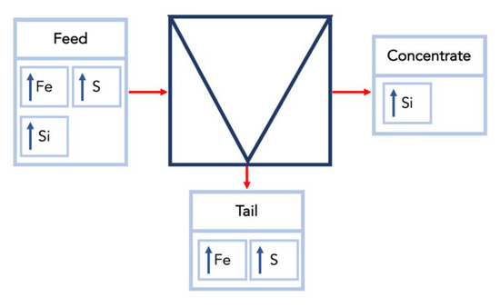 Subsequently, the flotation stage was continued, which lasted 15 min and consisted of giving way to the injection of air into the cell, which generated the separation of the materials of interest. Once this time was completed, the process of filtration and drying of the concentrate and tail was carried out in a Edemet pressure filter and a drying oven for approximately 24 h at a temperature of 100 °C. Later, the corresponding analysis was carried out using XRF to determine the content of Fe, S, and Si in each sample and finally to calculate the metallurgical indexes.