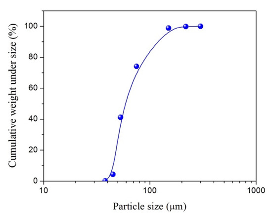 Figure 3 presents the particle size distribution of the gold–silver tailings sample used to produce the foams, in which it is observed that the samples used have an approximate d80 of 78 microns and a d50 of about 40 microns and additionally, a density of 2.6 g/cm3.
