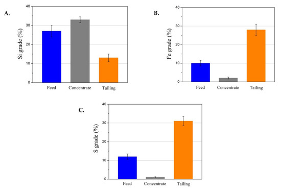 Comparative plot of the grades of Si (A), Fe (B), and S (C) present in the different stages of the flotation process.