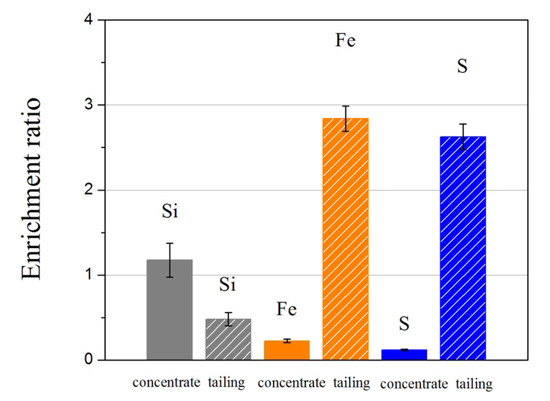 Enrichment ratio of Si, Fe, and S for the concentrated flotation samples.