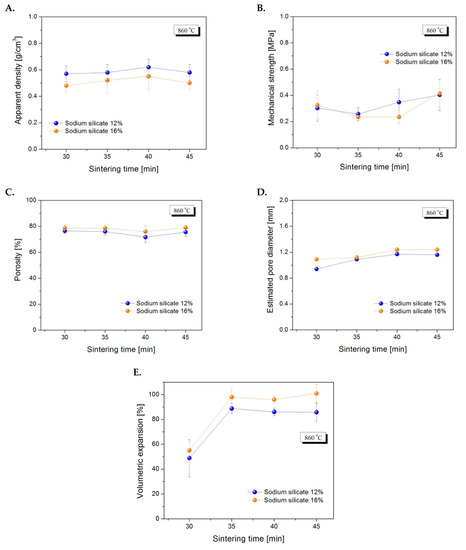 On the other hand, Figure 8C–E show the effect of the change in sintering time on the apparent density, porosity, and average pore diameter of foams obtained at a fixed temperature of 860 °C. In the figures, it is possible to see that the increase in the sintering time did not generate a wide variation in the porosity developed by the samples, because they oscillated at values close to 80%. However, it should be observed that the volumetric expansion and the average pore diameter are closely related to each other, since longer sintering times resulted in greater porosity, volumetric expansion, and pore diameter.