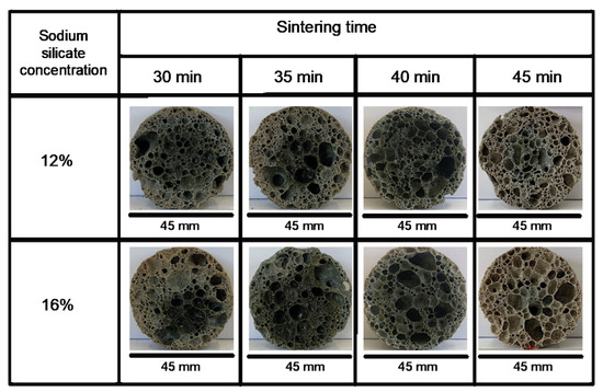 On the other hand, Figure 9 shows the cross-sections of the foams obtained at different sintering times and percentages of foaming agent of 12% and 16%. In the figure, it is possible to observe that regardless of the percentage of foaming agent used and the different sintering times studied, there was a high porosity and a homogeneous distribution of pores along the entire surface. In addition, it was observed that a longer sintering time allowed a complete development of foam sintering when a sample was observed with a white coloration throughout the cross-section, independent of the percentage of foam used.