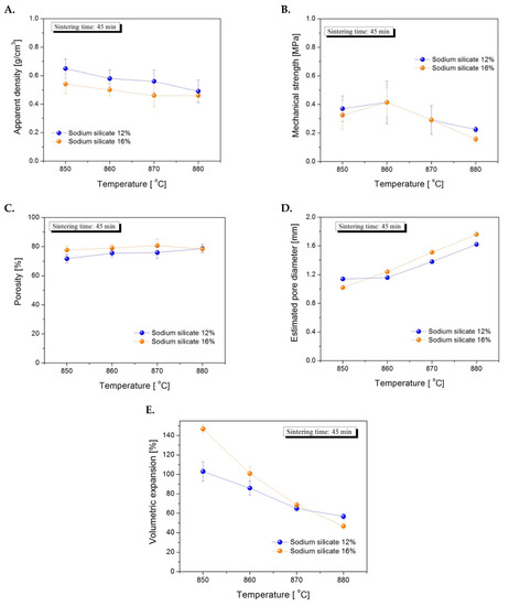 Effect of the sintering temperature on the characteristics of the ceramic foams obtained at a sintering time of 45 min: apparent density (A), mechanical strength (B), porosity (C), pore diameter (D) and volumetric expansion (E).