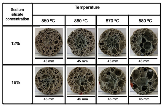 Finally, Figure 11 shows the cross-sections of the foams obtained as a function of the sintering temperature using a foam percentage of 12% and 16%. In the figure, it is possible to observe that in general, there was a homogeneous development of porosity throughout the cross-section of the samples. However, it should be noted that as the sintering temperature increased, larger and fewer pores were generated, as a result of the coalescence of the pores as the temperature increased, which occurred to a greater extent when 16% foaming agent was used.