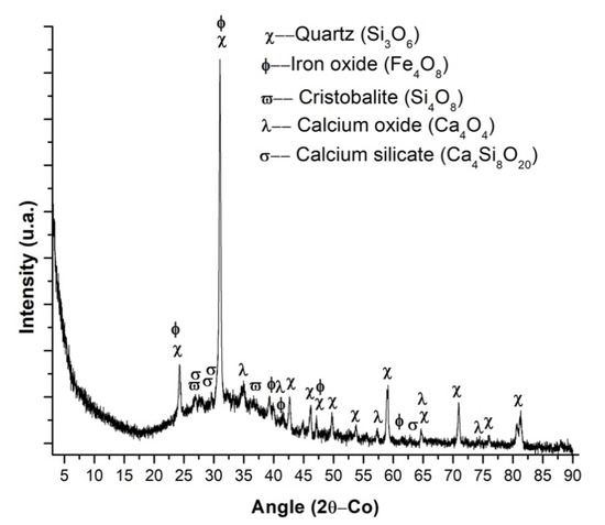 Figure 12 shows the X-ray diffractograms of a sample after the sintering process with 16 wt % sodium silicate and obtained at 860 °C for 45 min. This sample was selected because it had the best results from the physical characterization (density, mechanical resistance, porosity, etc.). It can be observed that the sample was mainly composed of quartz (COD 9009666) and cristobalite (COD 9008226), this being a polymorph of silica that occurs at temperatures above 700 °C. Calcium oxide (COD 9006568) and calcium silicate (COD 8103723) were generated by the transformation of the fluxing and foaming agents added during the stage of elaboration of foams and also are usually observed in devitrified soda-lime glasses. Finally, iron oxide (COD 9003076) is also present as part of the desulfurization process of the pyrite at temperatures above 500 °C.