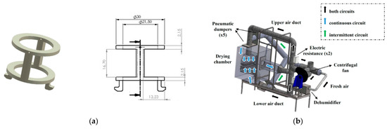 Boy et al. [23] and Boy et al. [24] previously described the air impingement dryer equipment. The dryer mostly consists of a dehumidifier and a centrifugal fan to supply the air in two separate cylindrical ducts (0.25 m diameter), each with an electrical heater and joined to each other in the drying chamber. At the exit of the drying chamber, the air circulates back to the fan with a degree of recirculation of 100% (Figure 1b). Inside the drying chamber, the air temperature was controlled. Both the hot air heating and the airflow were in continuous operation, meaning that the airflow continuously circulated in a closed circuit surrounding the samples.