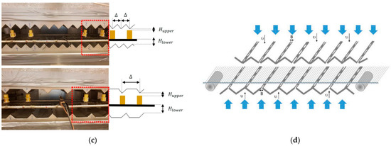 The setup of the air jets was original as they were created by triangular nozzles pierced with rectangular slots (Figure 1c). Two nozzle-to-nozzle spacings (Δ = 5 × 10−2 m and 10 × 10 2 m), two slot widths (B = 2 × 10−3 m and 4 × 10−3 m), and two heights between the nozzle outlet and the sample surface for the upper part were tested (Hupper = 1.2 × 10−2 m and 2.4 × 10−2 m). The height for the lower part was fixed (Hlower = 2.5 × 10−2 m). The airflow was circulated perpendicular to the sample surface and the sample was placed on a grid subjected to a back-and-forth motion which allowed for the entire surface to be covered by the airflow.