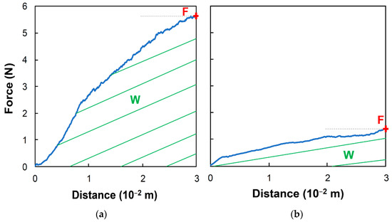 Force versus distance curve obtained during a penetration test on: (a) fresh apple; (b) dried apple by air impinging jets (trial n°13, Table 2).