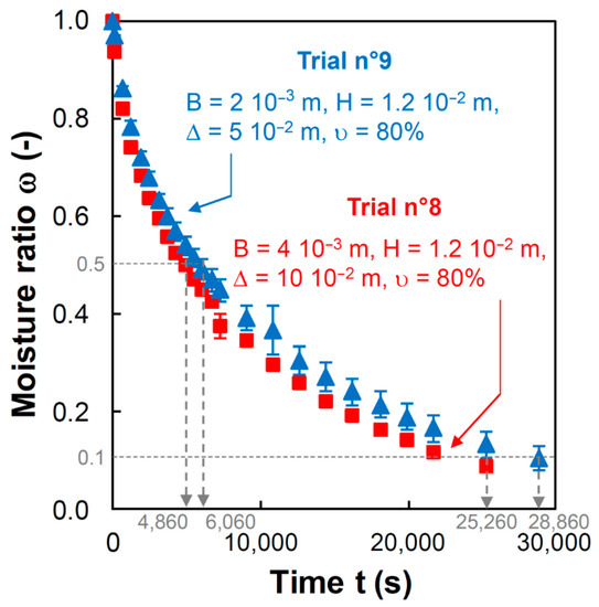 The moisture ratio versus time is plotted on Figure 3 for two extreme drying times (trials n°8 and n°9, Table 2).