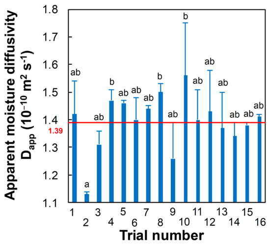 The average value obtained in the 16 trials of the DoE was 1.39 ± 0.06 × 10−10 m2 s−1. A one-way ANOVA on Dapp values shows few significant differences between the tests (p-value ≤ 0.1). From Figure 4, the highest value of Dapp (1.56 ± 0.19 × 10−10 m2 s−1) is obtained in trial n°10 (B = 2 × 10−3 m, H = 1.2 × 10−2 m, Δ = 5 × 10−2 m, and υ = 99%), while the lowest value (1.13 ± 0.01 × 10−10 m2 s−1) is achieved in trial n°2 (B = 2 × 10−3 m, H = 1.2 × 10−2 m, Δ = 10 × 10−2 m, and υ = 99%). The difference between the two tests comes from the nozzle-to-nozzle spacing value. This is an interesting result because it states that a low nozzle-to-nozzle spacing helps to increase the moisture diffusivity within the product during the drying. Furthermore, this result supports the ANOVA analysis on heat and mass transfer coefficients (previous section) where it has been noticed that a low nozzle-to-nozzle spacing tends to improve the transfer phenomena that occur during the drying process.
