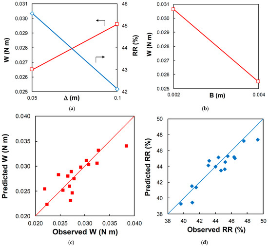 ANOVA results for the quality attributes (work associated with hardness and rehydration ratio) of the dried apple: (a) interaction plot with the nozzle-to-nozzle spacing; (b) interaction plot with the width slot; (c) predicted versus observed work associated with hardness; (d) predicted versus observed rehydration ratio.