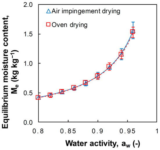 The water sorption isotherms were modelled using the GAB (Guggenheim–Anderson–de Boer) model according to Equation (2). Values of the corresponding parameters for the two drying processes and the statistical parameters that allow for evaluating the quality of the fit are presented in Table 5.