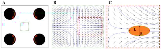 The same stress balance reasoning can be used to describe the dynamic response in terms of how the shape of the drop evolves with time when passing through the laminar flow in the four-roller mill (i.e., predicting L(t) and B(t)). Looking at it from the perspective of an individual drop entering the four-roller device, the encountered velocity gradient varies over time (as it travels with the flow-field in Figure 2B). However, the stress driving the instantaneous deformation can be modelled from the difference between disruptive stress (Equation (1)) and stabilizing stress (Equation (2)), leading to an ordinary differential equation describing (deterministically) how L(t) and B(t) evolve over time. Such a model fits well with empirical observations of drop deformation in the four-roller mill [].