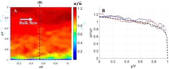 Illustration of the instantaneous flow in a channel with developed turbulence; (A) velocity magnitude of instantaneous stream-wise velocities in a subsection of the channel (wall at y = −1, y = 0 represents the center axis); (B) stream-wise velocity profiles in the channel, showing the instantaneous velocities at three randomly chosen points in time (black, red and blue dots) and the time-averaged velocity according to Prandtl’s 1/7th power law (dashed line).