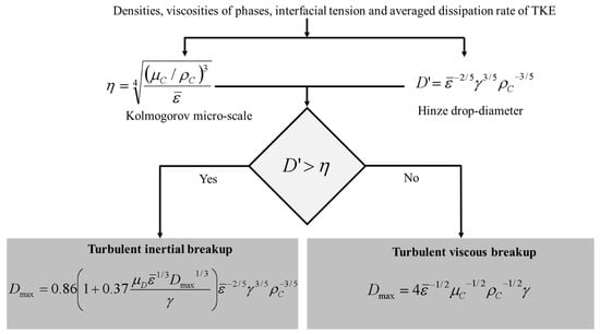 The extended Kolmogorov–Hinze framework for estimating the largest drop surviving prolonged exposure to a turbulent field is illustrated in Figure 4 (illustrating the algorithmic interpretation as first explicitly suggested by Vankova et al. []), and has been shown to fit well with empirical data across a wide range of fluid properties, turbulence intensities and device geometries [,,,], as long as the emulsifier concentration is sufficiently high to completely cover the drop interface [].