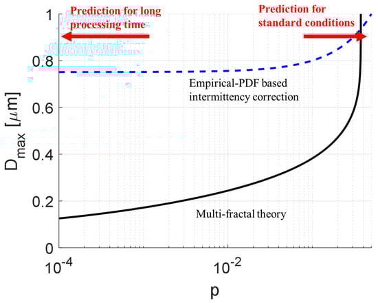Figure 9 compares the multi-fractal and empirical-PDF-based suggestions, showing what they predict in terms of how the maximum drop diameter depends on p (i.e., of how high the instantaneous probability of exceeding the stabilizing stress must be to achieve breakup). We can interpret the horizontal axis as a measure of how long the emulsion has spent in the turbulent flow. The longer time it spends there, the more unlikely events must be considered. Both theories predict that the drop diameter decreases below the traditional Kolmogorov–Hinze limit if spending a sufficient time in the device. The two theories differ, however, in the extent and in the behavior they predict for long time-periods. The multi-fractal theory suggests a stronger effect with p whereas the empirical PDF-based suggestion predicts a relatively weak effect that levels off at p ≈ 0.01. From a practical perspective, the multi-fractal theory suggests that the decrease of Dmax with time is stronger and that Dmax continues to increase for a longer time, whereas the empirical-PDF- based suggestion predicts that Dmax levels out after a shorter processing time.