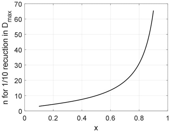 The prediction according to Equation (11) has been inserted in Figure 5 (red dotted line) to compare the two suggestions. As seen in the figure, the two-equation suggestion deviates substantially from Equation (11), particularly by suggesting a steeper viscosity ratio dependence. The good fit between Equation (11) and empirical data (even at high viscosity ratios) [,,,] suggests that the two-equation correction would fare poorly if subjected to empirical testing. Note, for example, that the predicted maximum drop diameter according to the two-criterion suggestion is close to 2 µm for the dairy-HPH operating at 25 MPa, which is substantially higher than what empirical data suggest [].