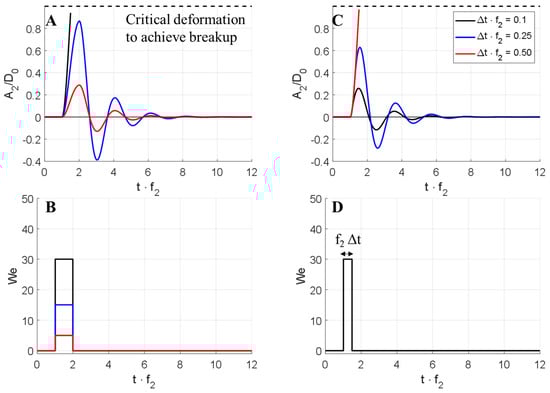 The dynamic response of the drop deformation with time is slightly more complex in a more complex laminar flow [,,], and comprehensive reviews are available elsewhere [,]. However, the stress acting on a drop in a given position x remains independent of time and can be determined with full certainty. Injecting a second drop at the same position will give rise to the same time-history, deformation and breakup position.