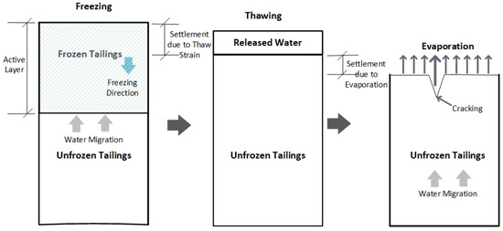 Since environmental dewatering processes (freeze–thaw dewatering, evaporation, desiccation) are economical and cost-efficient, a combination of these processes can be considered as additional dewatering technologies contributing to creating a reclaimable deposit. Figure 1 shows a simplified diagram of the environmental processes contributing to dewatering from the tailings.