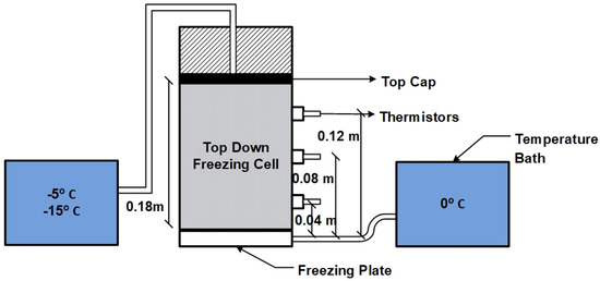Figure 2 shows the schematic diagram of the laboratory freeze–thaw test setup. These small-scale freezing tests were carried out in cylindrical freezing cells (0.1 m dia × 0.22 m height) within a walk-in freezer where the samples were frozen from top-down (one dimensional) under two different temperature gradients of 0.083 and 0.028 °C/mm. These two temperature gradients were applied to the freezing cells through two temperature baths where the top boundary temperatures were set at −15 (to achieve 0.083 °C/mm) and −5 °C (to achieve 0.028 °C/mm) and the bottom boundary temperature was set at 0 °C in order to replicate the average temperature of Fort McMurray. The installation of the insulation wrap and the thermoelectric cooling plate were all applied in order to ensure one-dimensional freezing and to represent the freezing process that occurs in nature.