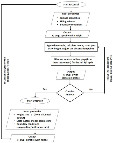 Figure 3 shows the flowchart diagram of the coupling analysis. FSConsol was first run where the initial (height and void ratio) and boundary conditions similar to the laboratory were applied. A hydrostatic condition was assumed for the very first run. The boundary conditions at the top were specified as a constant water cap thickness of zero so that all the fluid will be drained off the top as the tailings consolidate. Similarly, the bottom boundary condition was specified as impermeable so that no fluid can exit through the bottom of the cell to simulate the laboratory condition. For numerical modeling of the oil sands tailings, the large strain consolidation theory is generally adopted [4] that requires one to input the compressibility (void ratio, e and effective stress) and saturated hydraulic conductivity (Ksat—void ratio) properties in FSConsol to be obtained from a large strain consolidation test. Using the large strain consolidation apparatus, the material properties of each of the samples were determined. After the consolidation analysis, the output results such as the void ratio (e), pore water pressure (pwp) and solids content (s) at different pre-sets depths were recorded. Next, solids contents were converted to the bulk density using the mass–volume relationship, and the thaw strain was applied to the analysis. The relationship between the thaw strain and bulk density for the centrifuged tailings samples under temperature gradients of 0.083 and 0.028 °C/mm is represented below using Equations (1) and (2), respectively:
