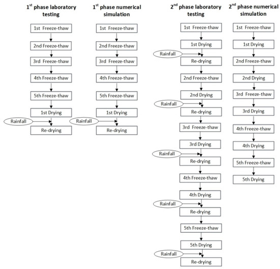 For the numerical modeling, a sequence similar to the laboratory was followed. Figure 4 shows the sequences of laboratory and modeling simulation of the first- and second-phase testing. However, due to the complexity of the coupling analysis in the second-phase testing (five alternate freeze–thaw and drying–wetting cycles), re-drying after the wetting event was not simulated in the numerical model.
