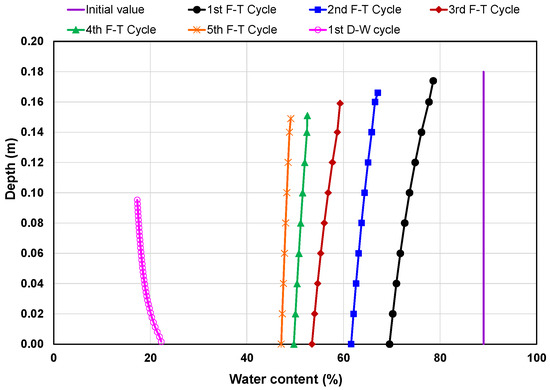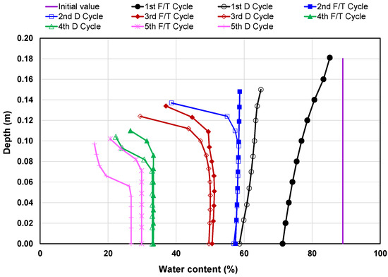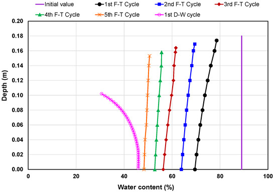The first-phase numerical modeling of laboratory testing was run for five consecutive freeze–thaw cycles under two freezing temperature gradients of 0.083 and 0.028 °C/mm followed by a single drying–wetting cycle. Two separate scenarios were modeled here using coupling analysis incorporating the material properties, volume change relationships and the laboratory testing sequences reported above. The model-predicted water contents along with the change in elevation after each cycle (denoted as F/T cycle for each freeze–thaw cycle and D-W cycle for the drying–wetting cycle in the figures) are displayed in Figure 5 and Figure 6. Both figures show that the water contents were consistently decreasing with the freeze–thaw cycles, and by the fifth cycle, nearly half of the water had been lost (44 and 46% reduction in water content for the temperature gradients of 0.083 and 0.028 °C/mm, respectively). When drying/evaporation was incorporated in the numerical simulation, both these samples further dewatered to two-fold lower water content (Figure 5) for the higher-gradient sample and five-fold lower water content (Figure 6) for the lower-gradient sample, as compared to the initial value.