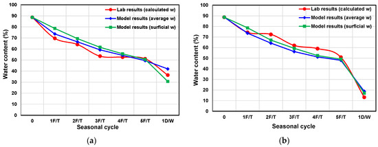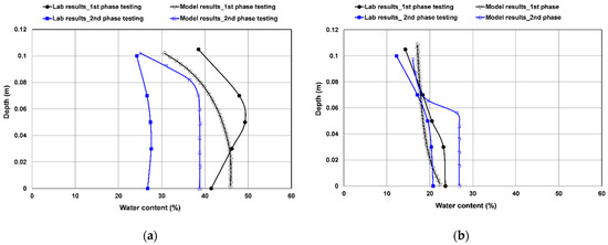 As evident in Figure 9, the differences between the model prediction and the laboratory computational results were marginal. However, the model overpredicted water content values compared to the laboratory results for the higher-temperature-gradient sample (Figure 9a), while it showed the reversed pattern for the lower-temperature-gradient sample (Figure 9b). The second-phase testing, as shown in Figure 10, shows a different trend. The laboratory results for both samples corroborated well with the model-predicted water contents at the surface.