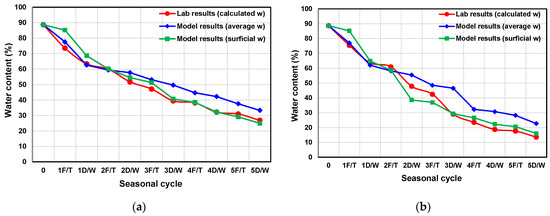 Figure 9 and Figure 10 illustrate the cumulative decrease in water content for the two centrifuged tailings samples under the temperature gradients of 0.083 and 0.028 °C/mm, respectively, after each seasonal cycle, where Figure 9 compares the first-phase laboratory testing and modeling results and Figure 10 compares the second-phase testing results between laboratory computation and model prediction. The water content obtained from the laboratory after each seasonal cycle was calculated on the basis of the thaw strain during freeze–thaw cycles and the changes in weight loss/gain during drying–wetting cycles. Hence, the water content per cycle obtained from the laboratory represents the average water content throughout the depth. In terms of numerical modeling, both the average and surface values were reported on the graph as the deposit surface is expected to dewater the most, given it is the most susceptible to the effects of seasonal weathering.