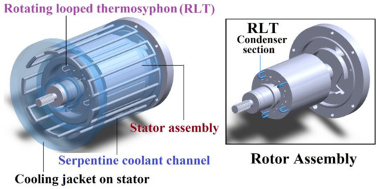 Conceptual cooling design of an electric motor with an RLT in the rotor. The volumetric heat flux in the rotating rotor is transferred passively by the RLTs from the rotor to the air plenum encapsulated within the cylindrical cooling jacket and the end cover of the motor. Liquid coolant flows along the serpentine cooing channel in the cylindrical jacket extended from the stator to transfer all the thermal power out of the motor.