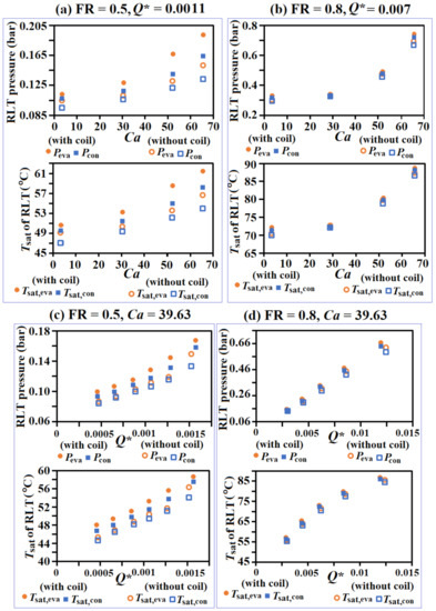 In Figure 3a,b, for the RLTs with and without coil at the FRs of 0.5 and 0.8, the Peva and Pcon (Tsat,eva and Tsat,con) increased along with Ca, owing to the enhanced centrifugal acceleration. In Figure 3a with FR = 0.5, the Peva-to-Pcon (Tsat,eva-to-Tsat,con) differences and the pressure (saturated temperature) differences between the RLTs with and without coil were enlarged when Ca increased. However, such enlarged pressure (saturated temperature) differences driven by increasing Ca were considerably moderated at FR = 0.8 in Figure 3b. Unlike the RLTs with FR = 0.5, the presence of the liquid phase along the inner and outer legs of the RLTs at FR = 0.8 ensured the heating process along the inner and outer legs at the saturated condition prior to the dry-out limit. With FR = 0.5, the heating process along the inner leg of the RLT took place at the superheated conditions. The substantial thermal performance improvements were, hence, achieved by increasing FR from 0.5 to 0.8 for the RLTs with and without coil, which will be later demonstrated.