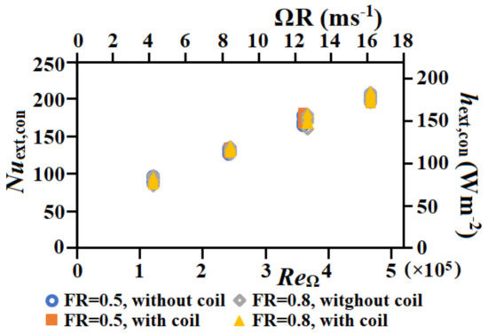 As the airflows over the rotating condenser bends for all the RLTs with and without coil at the filling ratios of 0.5 and 0.8 were geometrically and dynamically similar, the four sets of Nuext,con (hext,con) data were converged on a tight data band at each ReΩ (ΩR) in Figure 7. Following the converged data trends in Figure 7 with a diminished airflow and, hence, forced convective heat transfer coefficient over the condenser at zero speed, the Nuext,con data were well fitted by the power law function in Equation (21) with the correlative coefficient of 0.98.
