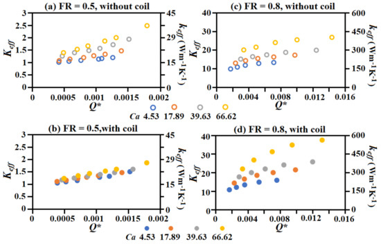 Keff (keff) variations against Q* at all the Ca tested for the RLTs with and without coil at the filling ratio of (a,b) 0.5 and (c,d) 0.8. All the Keff (keff) data were increased with Q* (Ca) at a fixed Ca (Q*).