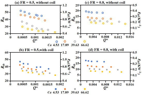 Rth (rth) variations against Q* at all the Ca values tested for the RLTs with and without coil at the filling ratios of (a,b) 0.5 and (c,d) 0.8. All the Rth (rth) data decreased with Q* (Ca) at a fixed Ca (Q*).