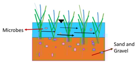 Subsurface flow (SSF) wetland substrate is composed of porous soil (rock and gravel) sealed from the bottom [9,13]. In the SSF, the water level should be below the soil level all the time (see Figure 2). The flow path in the SSF wetland is either a horizontal or vertical flow path. SSF wetlands are suitable for the treatment of wastewater, provided that the solid concentration in the wastewater is low. For high solid concentration in the wastewater, sedimentation tanks or basins are used to remove the solids from the wastewater [25,30,31]. The main advantages of SSF wetlands include tolerance of cold weather, fewer odor problems compared to SF wetlands, greater sorption and exchange sites compared to SF wetlands, and efficient use of the land compared to SF wetlands. SSF wetlands can be constructed below public parks because the water level is below the ground surface. The limitations of SSF wetlands include their higher cost compared to SF wetlands, used for small flows, and clogging of the pores [26,27].