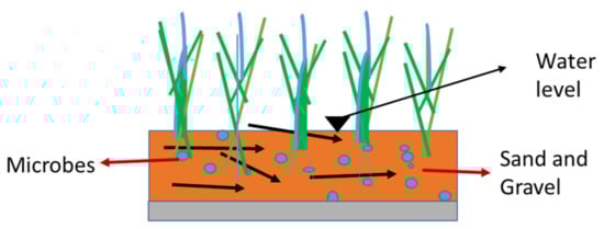 Expansion of urban populations has resulted in an increase in the footprint of domestic water supply and sewerage, giving a rise to greater quantities of wastewater. Properly managed municipal wastewater treatment would result in reducing surface water contamination problems [4,5,24]. The process of wastewater treatment not only conserves valuable water resources, but it also takes advantage of the nutrients contained in sewage to grow crops. Wastewater is increasingly viewed as an additional source that can provide a new source of good quality water. However, in many parts of the world, especially in under-developed countries, the operation cost of the wastewater treatment plant is an issue [5]. On the other hand, the applications of CWs for the treatment of domestic and municipal wastewater have been rapidly increasing throughout the world because of their unique advantages of lower operational and maintenance costs. Different types of contaminants (such as nitrogen, phosphorus, organics, solids, metals, and coliforms) can be removed from wastewater by CW treatment methods. This method includes a complex inter-connected system of plants, media, bulk water, and biomass population. The removal of biological oxygen demand (BOD), chemical oxygen demand (COD), total suspended solids (TSS), nitrogen and phosphorous pollutants, heavy metals, and different organic matter (e.g., amino acids, fatty acids, proteins, carbohydrates, lipids) by CW systems have gained substantial attention in recent years [25,49]. In subsurface flow wetlands, the removal of contaminants depends on a diverse range of co-existing physical, chemical, and biological routes depending on numerous environmental and operational factors.