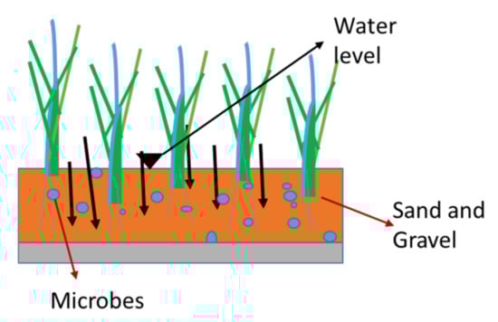 The horizontal subsurface flow (HSSF) is composed of a channel located below the ground surface [9,13]. The channel is filled with selected types and sizes of gravel and sand. The channel is planted with a suitable plant. There are certain considerations that should be taken into account when designing the channel. For instance, the water flow in HSSF is designed such that the level of the water is below the ground surface. Solids should also be removed from the wastewater before entering the channel to avoid clogging [13]. A sedimentation tank or filter are usually used to remove the solid particles from the wastewater. The cross-sectional area of the HSSF plays a dominant role in the efficiency of the decontamination process. The oxygen level in the HSSF should be enough to promote the growth and metabolism of aerobic bacteria as well as plants. Many mechanisms facilitate oxygen transfer to the subsurface environment. Plant roots contribute to the increase in oxygen in the environment near the roots [5,9,13].