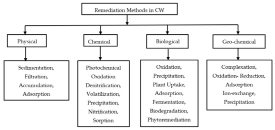 In the last decade, environmental awareness has increased, and the treatment of environmental pollution and contamination has become the main agenda of concerned governmental bodies around the world. Usually, a suitable environmental remediation method for a certain type of waste is selected based on the effectiveness of the degradation process and the cost of the method [1,2,3]. More importantly, the environmental impact of the selected method is of special concern because in some remediation methods the daughter product of the degradation process is more toxic than the original contaminant. Scientists and researchers believe that there is no single universal remediation method suitable for all types of contaminants and all sources; instead, an effective remediation program may involve the collective implementation of two or more methods [1,2]. Wetlands are one of the effective remediation technologies that now attract the environmentalist for the treatment of wastewater contaminants [2]. Mother Nature, through natural wetlands, removes contaminants from water resources through different natural processes including biodegradation, sorption, phytostabilization, phytoextraction, and rhizofiltration [2,4,5,6,7]. Constructed wetlands are developed to mimic the natural processes in removing/degrading contaminants in wastewater [8,9]. Municipal wastewater, industrial wastewater (particularly petroleum refinery and sour-water treatment wastewater products), agriculture wastewater, stormwater, textile wastewater, landfill leachates, mining drainage, etc., are examples of contaminated wastewater that can be treated using wetlands [10,11,12]. Constructed wetlands use natural processes in degrading contamination; therefore, it is an environmentally friendly remediation method with minimum adverse environmental impact [13]. CW is designed to treat wastewater from different sources similar to common effluent treatment plants [14].