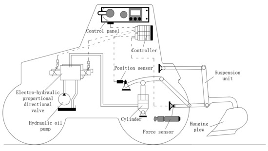 When the operating system is farming, it is simultaneously affected by the depth of the plow and the resistance of the soil. Therefore, in this paper, sensors are used to measure farming data in real-time and introduce the idea of weight distribution to organically couple the plow depth and the force of the plow to form a comprehensive control of the force–position, as shown in Figure 2.