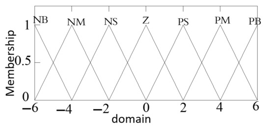 To satisfy the tractor’s intricately changing farming environment, the basic universes of the tillage depth difference and its change rate are, respectively, taken as [−12,12] and [−50,50], and the universe of adjustment u is taken as [−3.6,3.6]; and the three variables are all with [−6,6] as their fuzzy universe. At the same time, to cover each variable more comprehensively, 7 subsets {NB, NM, NS, Z, PS, PM, PB} are selected to show the dynamics of each parameter. The subsets of respectively indicate that the current tillage depth is compared with the set tillage depth as: “extremely large depth”, “great depth”, “general depth”, “same depth”, “shallow depth”, “very shallow depth”, “extremely shallow depth”; the subset of means “very fast deepening speed”, “higher deepening speed”, “slower deepening speed”, “changing speed unchanged”, “slower shallowing speed”, “faster shallowing”, “extremely fast shallowing”, and the membership relationship between each variable is described with a triangle, as shown in Figure 4.