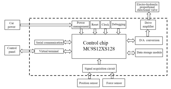 The electronically controlled hydraulic suspension operating system is a negative feedback system composed of a suspension system, a control module, and a sensing element added to the agricultural tractor platform. The main internal module structure is shown in Figure 1.