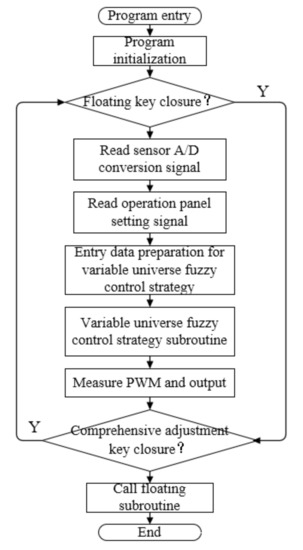 When the joint automatic adjustment pin is at a low level, the system executes the joint adjustment subroutine after initialization and judges whether the floating key is closed. If it is closed, the system directly calls the floating adjustment subroutine and does not execute the plow depth adjustment instruction. If the floating key is turned on, the system transmits the information to the main control unit after completing the A/D conversion, judging the adjustment mode required by the current state, calculating the PWM output signal according to the corresponding algorithm, and then sending the lifting command to the suspension unit. During the tractor farming process, the joint adjustment key is always closed, and the system continues to execute the joint automatic adjustment subroutine until the farming is completed, the joint adjustment key is opened, and the system returns to the floating state, as shown in Figure 8.
