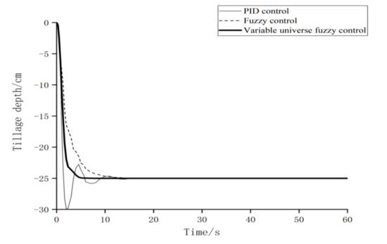 During the steady-state fluctuation phase of the experiment (20–60 s), the maximum tillage depth of the PID control is 27.26 cm, the minimum is 24.12 cm, and the deviation interval is 3.14 cm; the maximum traction force controlled by PID is 7625 N, the minimum is 6783 N, and the deviation interval is 842 N. PID control farming uniformity is poor and load fluctuation is obvious. The extreme value of the fuzzy control tillage depth is 26.53 cm and 24.43 cm, respectively, and the extreme value of the traction force is 7425 N and 6871 N, respectively, and the tillage quality has been improved. The extreme values of tillage depth of the variable-universe fuzzy control are 26.35 cm and 24.75 cm, respectively, and the deviation range is reduced to 1.6 cm; the extreme values of traction force are 7388 N and 6960 N, respectively, and the deviation range is improved to 428 N, so its work quality and load stability have been significantly improved.