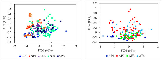 Principal component score plots of NIR spectra of different grain sorghum populations including starch (left) and amylose (right) data sets.