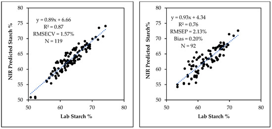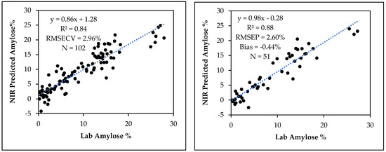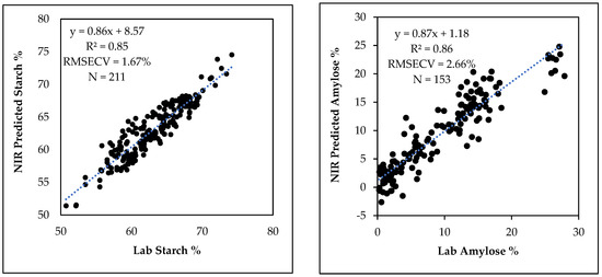 Lab-determined versus NIR predicted final starch (left) and amylose (right) cross validated calibrations constructed by combining all spectra in the calibration and validation datasets.