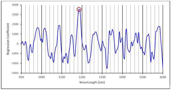 Analysis of the regression coefficient plots of the PLS models is important to make sure that the key wavelengths of the model are related to the spectroscopic signal of the interested constituent molecule to ensure the validity of the NIR spectroscopy model [31,32]. The regression coefficient plot for the starch calibration model with 11 PLS factors is shown in Figure 4. Some of the key regression peaks, both positive and negative, in the regression coefficient plot that may have direct or indirect relation with the sorghum grain starch content may be due to second overtone of C-H stretch (peaks around 1160, 1205, 1240 nm), C-H stretch + C-H deformation (1365 and 1390 nm), first overtone of O-H stretch of starch (1580 nm) and first overtone of C-H stretch (1645 nm) vibrations of different C-H and O-H groups of starch [33,34].Therefore, it is possible that the starch model is capable of predicting the starch content of whole grain samples by using the interactions between some key NIR wavelengths and starch molecules in the grain. Hence, these results suggest that NIR spectroscopy can be used to predict starch contents of intact grain samples.