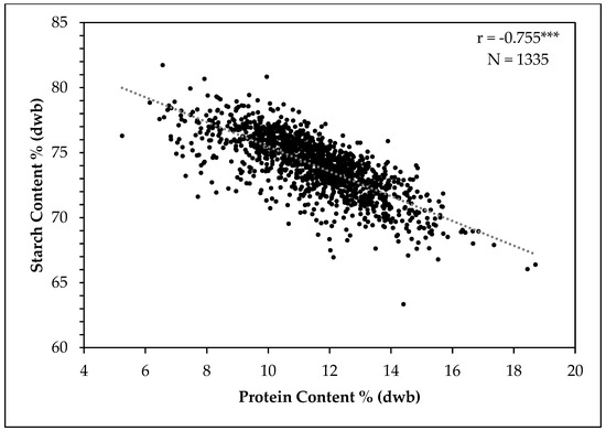 The relationship between the dry weight basis starch and protein contents in grain sorghum based on NIR predictions of 1337 grain samples from the two breeding populations is shown in Figure 8. There was a negative relationship between starch and protein percent in grain sorghum (r = −0.755, p < 10−181). Previous studies have shown mixed results regarding the association between starch and protein contents of sorghum grain. Subramanian and Jambunathan (1981) [38] found a strong negative correlation between starch and protein, while Buffo et al., (1998) [39] found no relationship. However, Buffo et al., (1998) [39] evaluated only 45–46 commercial hybrids and the range of starch and protein was narrow compared to the current study. Rhodes et al., (2017) evaluated 265 accessions and also reported a strong negative relationship between starch and protein contents in sorghum grain [40]. We evaluated a large number of samples covering a very wide range of starch and protein contents, and our results further confirm that there is a strong negative relationship between starch and protein content (on a percentage basis) in grain sorghum.