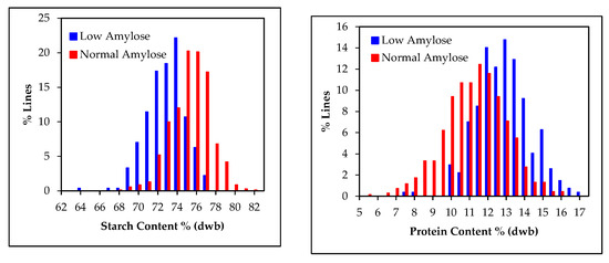 Variability of NIR predicted dry weight basis starch and protein contents in the low amylose (Amylose < 5%) and normal amylose (Amylose > 15%) grain samples of the two breeding populations.